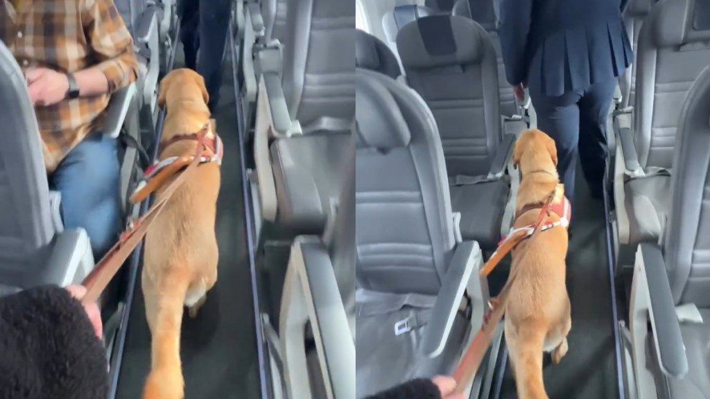 Guide dog leads the way for ‘blind owner’ to her seat on plane in video