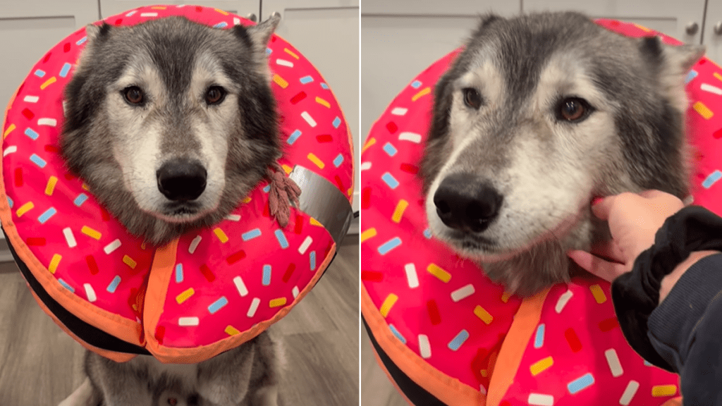 In the video, the dog sits in the kitchen with his donut costume — a donut-shaped recovery collar — allegedly grumpy that his owner sneaked pills into his food. He stares at his owner with his unimpressed and slightly betrayed eyes. His owner tries to apologize, but she can’t stop laughing at the look, telling him, “I know you’re tryna be mad, but you look just so cute.”