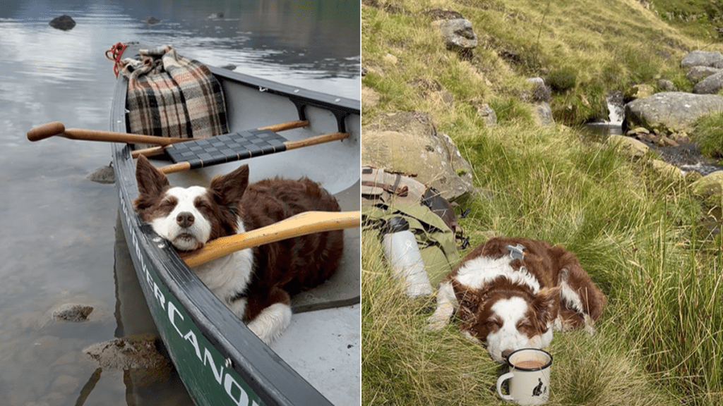 The footage is a montage of her sleeping in breathtakingly beautiful locations. In the first shot, she is in a canoe on a lake. Birds are singing. She’s resting her chin on the bars of the boat, and she’s happily sleeping. Then the scene changes to her resting on her human’s thighs near a tent. There are rolling hills behind them. All of it looks very calm. Over 80k people liked the video because it is so peaceful to watch. “Oh to be a dog with a traveling buddy,” one person wrote.