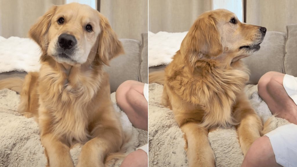 Mom asks, “Yeah?” then, “Really?” and Comet places a paw on dad’s knee and nods again. But then Mom gets to the real issue, asking the Golden Retriever, “Was Daddy nice to you when Mama was gone?” — and Comet stretches her head upward and backward, which Mom reads as a firm no. She asks, “No? What did he do?” and Comet lets out a small complaining sound.